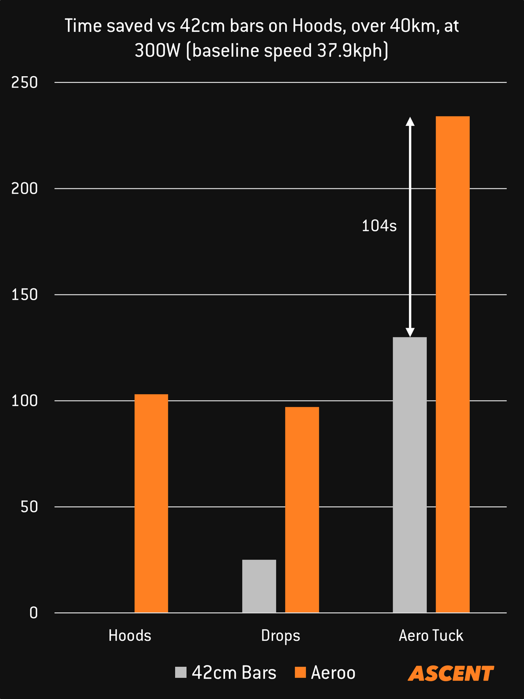 There also was a 104s advantage to the Aeroo bars in an aero tuck position when compared to 420mm drop bars in an identical aero tuck position.